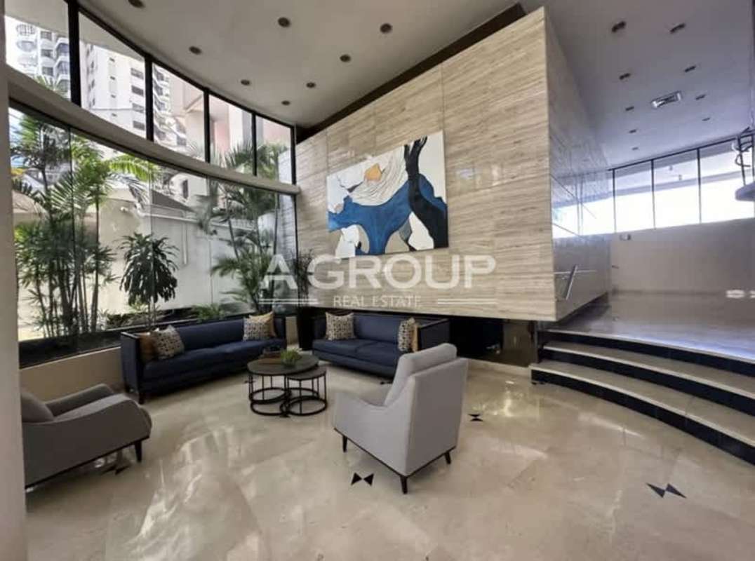 Spacious lobby with floor-to-ceiling windows, blue sofas, abstract wall art, Punta Paitilla Panama