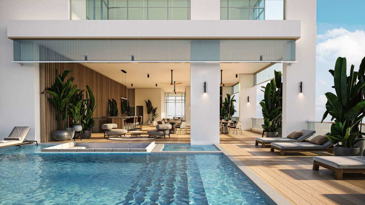 Skyline infinity-edge swimming pool overlooking ocean and city