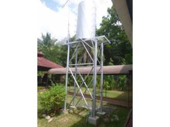 Outdoor water tank on metal frame amid green landscaped garden at Punta Barco Coronado beach property