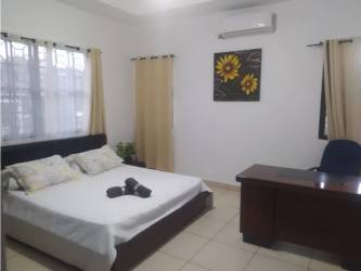 Spacious estate home and guest house located in the private gated community of Hacienda Pacifica, San Carlos. Main residence features 207 m² construction with 5 bedrooms, 3 bathrooms, modern ceramic floors, a large covered terrace, lush gardens, private swimming pool, built-in barbecue area and 4 covered parking spaces, ideal for entertaining. Separate guesthouse offers 120 m², 2 bedrooms, 3 bathrooms, private study and large pantry. The property sits on a generous 1500 m² lot with tropical landscaping. Enjoy serene mountain views, quick beach access and community amenities like tennis and clubhouse. Perfect for a large family, rental potential, or retirement. Listed at $495,000 – contact Casa Nova Realty Panama today.