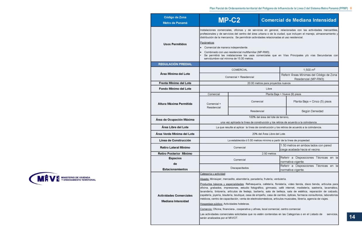 Official zoning regulation chart MP-C2 for commercial and residential development Pueblo Nuevo Panama