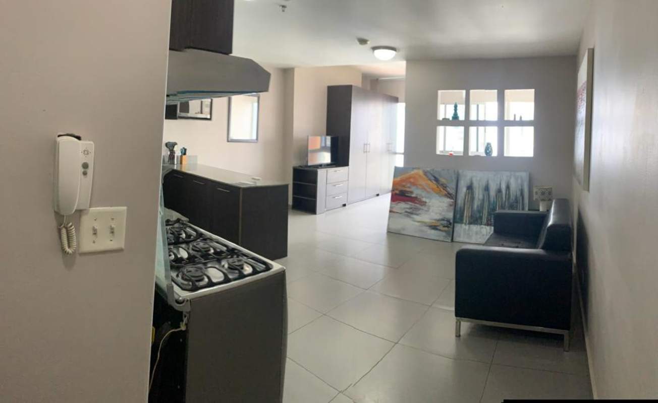 Modern studio apartment with open living space, kitchen and sofa at PH De Colores, Bella Vista, Panama City