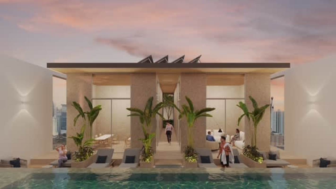 Rooftop terrace with infinity pool and tropical plants at sunset PH Gesti68 San Francisco Panama City