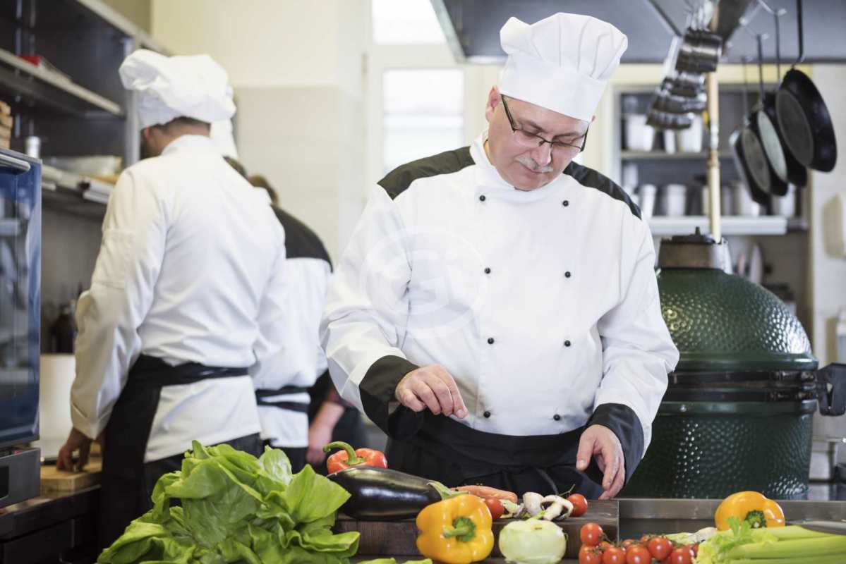 Kitchen: Industrial kitchen with ovens, refrigerators and full prep area.