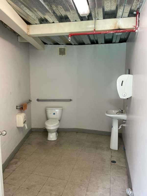 Commercial warehouse bathroom with pedestal sink, toilet, exposed beams, grab bars in Albrook Free Zone Panama